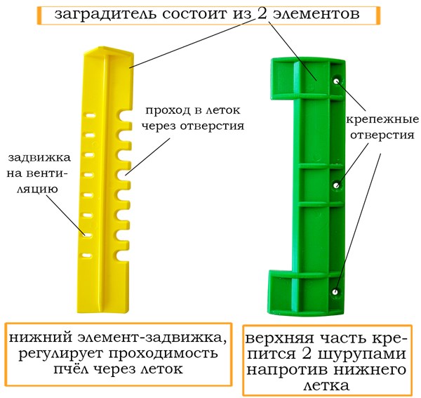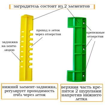 Заградитель состоит из двух элементов. Прямая роль нижнего ульевого заградителя – регулировка проходимости пчел через леток. Возможно установить несколько положений: без задвижки, на полный проход в леток, с задвижкой на проход через отверстия 8 мм и задвижкой на вентиляцию.