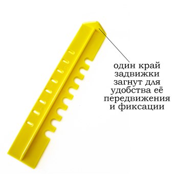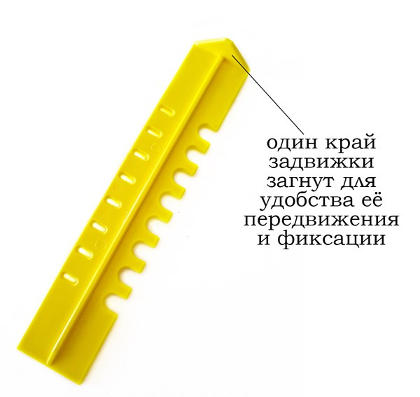 На задвижке с одной стороны отверстия, используемые в положении "вентиляция", с другой стороны фигурные вырезы в основании для прохода пчёл. Один край задвижки для удобства её передвижения и фиксации загнут. Накладная пластина крепится 2 шурупами напротив нижнего летка.