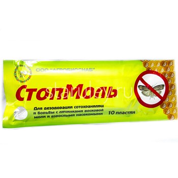 ДОЗЫ И СПОСОБ ПРИМЕНЕНИЯ: Сильно пораженные соты удаляют из улья и сокращают гнездо. Затем их, а также все восковое сырье, перетапливают на воск. Соты, неразрушенные молью и слабопораженные, пригодные для дальнейшего использования, обрабатывают биотехническим средством СТОПМОЛЬ. Для этого, в упаковке каждой пластины проделывают 4 отверстия по углам, диаметром по 1 см. Пластины раскладывают на соторамки, затем упаковывают в плотный целлофан или соторамки с пластинами помещают в герметичные сотохранилища. Обработку проводят из расчета одна пластины на 10-12 рамок суши. Пластину оставляют на срок в 45 суток, после чего пластину удаляют.