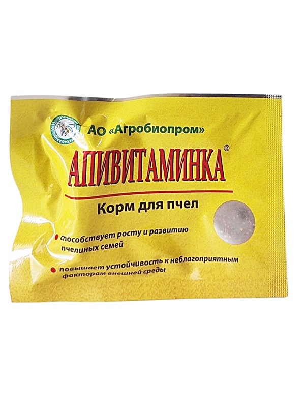 ОПИСАНИЕ: Для стимулирования слабых пчелосемей к развитию и размножению. Апивитаминка, как полноценный корм, применяется при общей нехватке витаминов и аминокислот ранней весной в период отсутствия или наличия невызревшей и несбалансированной по качеству пыльцы и осенью, при слабом пыльцевом взятке. Для усиления яйцекладки, профилактики и лечения стрессов. При токсических процессах, вызванных отравлением пестицидами, пыльцевым, нектарным и падевым токсикозами. Для восстановления и поддержки пчелосемей после продолжительного лечения антибиотиками.