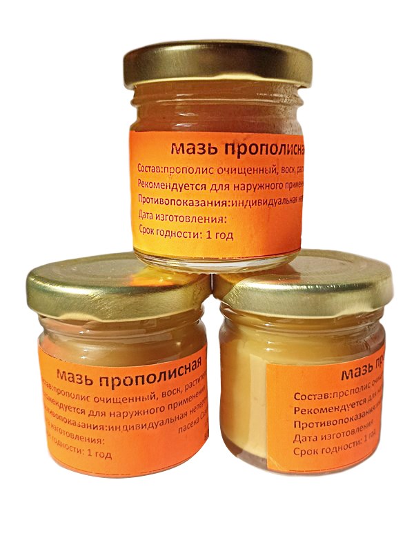 Показания и способ применения. Прополисная мазь предназначена для наружного применения. Показаниями к ее использованию служат ожоги, обморожения, труднозаживающие раны и язвы, экзема, себорейная экзема, гнойное поражение кожи, фурункулы слухового прохода, воспаления среднего уха, хронический насморк, зубная боль, мигрени, эрозии шейки матки (тампоном, смоченном в 2%-ном растворе соды удаляют слизь, затем к эрозии прижимают тампон с мазью и оставляют его на 10-12 ч., процедуры проводят ежедневно в течении 10-12 дней), трещины прямой кишки и геморрой (прикладывают марлевые салфетки с мазью), послеоперационные раны больных, и т. п.