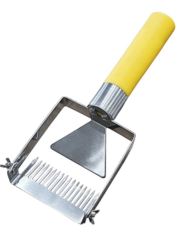 Вилка 7,7 см. для распечатки сот с 16-ю широкими иглами позволяет быстро и эффективно вручную распечатывать большое число рамок. При этом рука не устаёт так быстро, как с обычной вилкой, что позволяет выполнить большой объём работы за меньшее время. Суть работы в том, что глубина погружения зубцов регулируется направляющей лопаткой, и рука пчеловода при работе не находится в постоянном напряжении как с обычной вилкой.