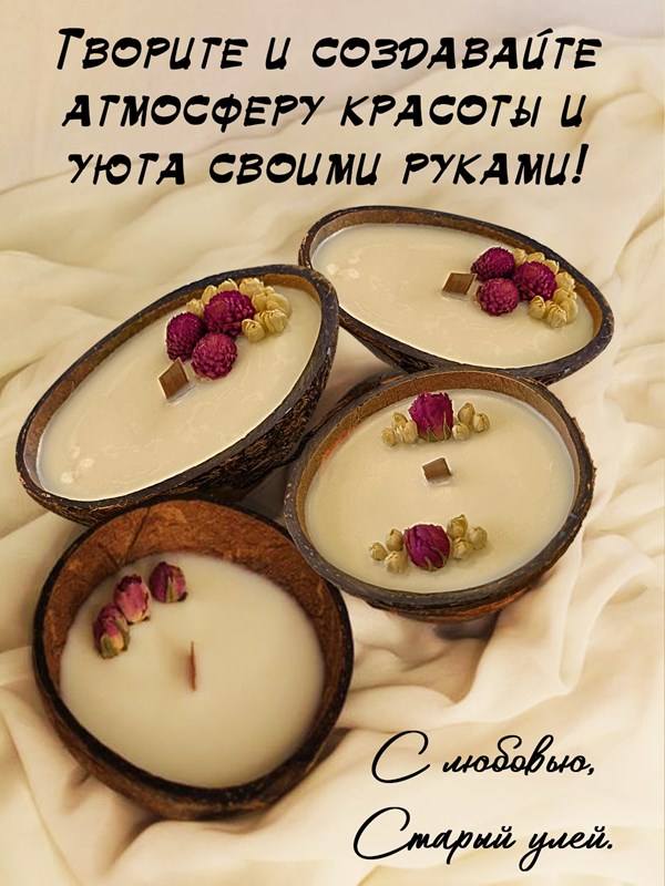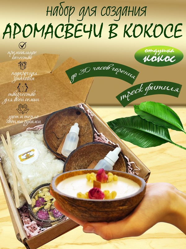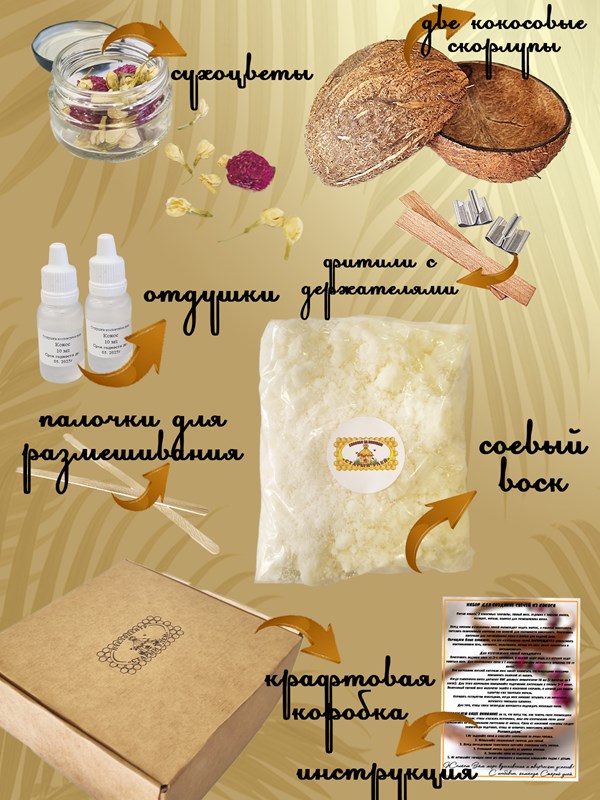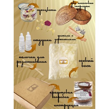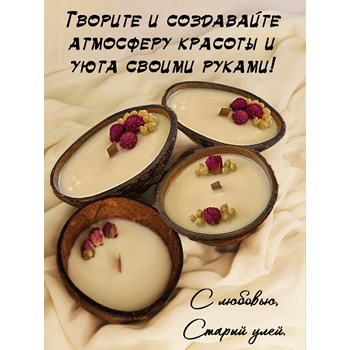 Этот набор отличается полностью натуральными компонентами, что позволяет Вам научиться создавать ароматические свечи, приносящие уют и комфорт в ваш дом. Каждая свеча, изготовленная собственноручно, будет украшением и радовать вас и ваших близких на протяжении длительного времени. Кокосовая свеча подойдет для любого интерьера, будь то спальня, гостинная, ванная комната или кухня, и гармонично впишется в любой дизайн.Эта свеча станет идеальным дополнением к романтическому вечеру, создавая неповторимую атмосферу. Следуя простым инструкциям, вы сможете легко создать собственный подарок, который принесет радость Вам или вашим близким. Данный набор также подходит для детей, позволяя провести интересное и полезное время, создавая уникальные свечи и осваивая новые навыки.