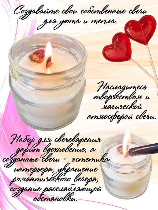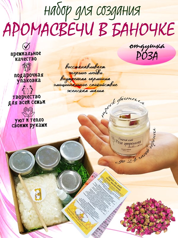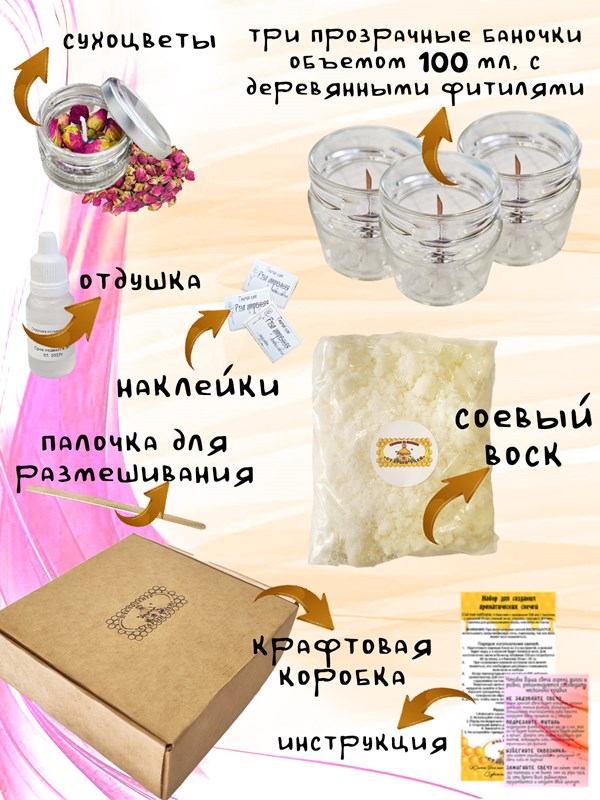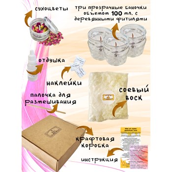 Набор для создания 3-х аромасвечей "Роза" наполнен всем необходимым: