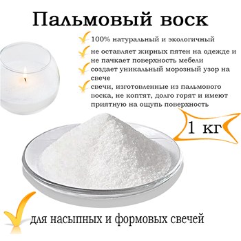 Пальмовый кристаллический воск, разработанный специально для изготовления формовых свечей с красивым кристаллическим рисунком. В зависимости от температуры розлива кристаллы могут быть больше или меньше. Воск бархатистый на ощупь и очень хорошо работает с цветопередачей, если вы его красите. Так же можно добавлять большое количество ароматизаторов (до 10%) без потери эффекта кристаллов.
